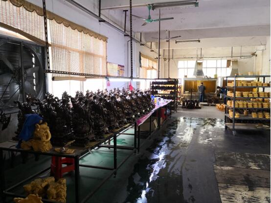 ? ? ? 因環(huán)保管控,中美藝嘉深圳工廠主要負責前期泥塑模型設計,及鍛造、后期上色等低污染低噪音工作。其余翻模、分段鑄造、焊接、打磨工作主要由中美藝嘉戰(zhàn)略合作單位惠州市惠陽區(qū)新圩新銅雕塑廠(2003年注冊成立,法人陳鋼47歲,深圳人)負責。據中美藝嘉謝工介紹,在有照片或設計圖稿的前提下,從泥模到鑄造成品,工期約40天(泥模按需多次精修的時間未計入)。