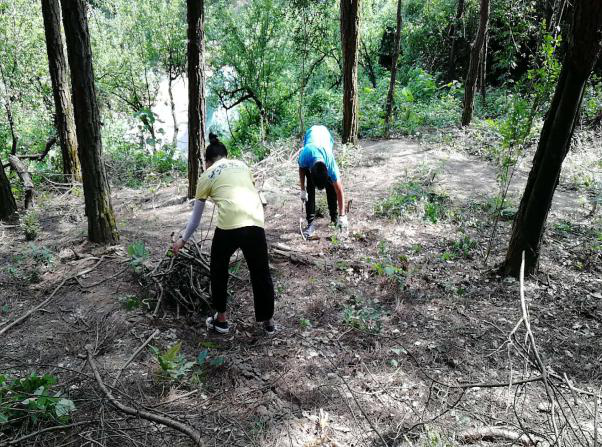 清場(chǎng):場(chǎng)地路面的枯枝與雜草處理。先是樹(shù)上的枯藤殘刺,身高不夠,我們就穿上裝備去到平臺(tái)上切割。地上雜草叢生,我們就一棵一棵的連根拔起。然后找來(lái)鮮騰捆好,一捆捆的背下山來(lái)。排除一切的蛇鼠蟲(chóng)蟻,為游客的舒心加把安全鎖。