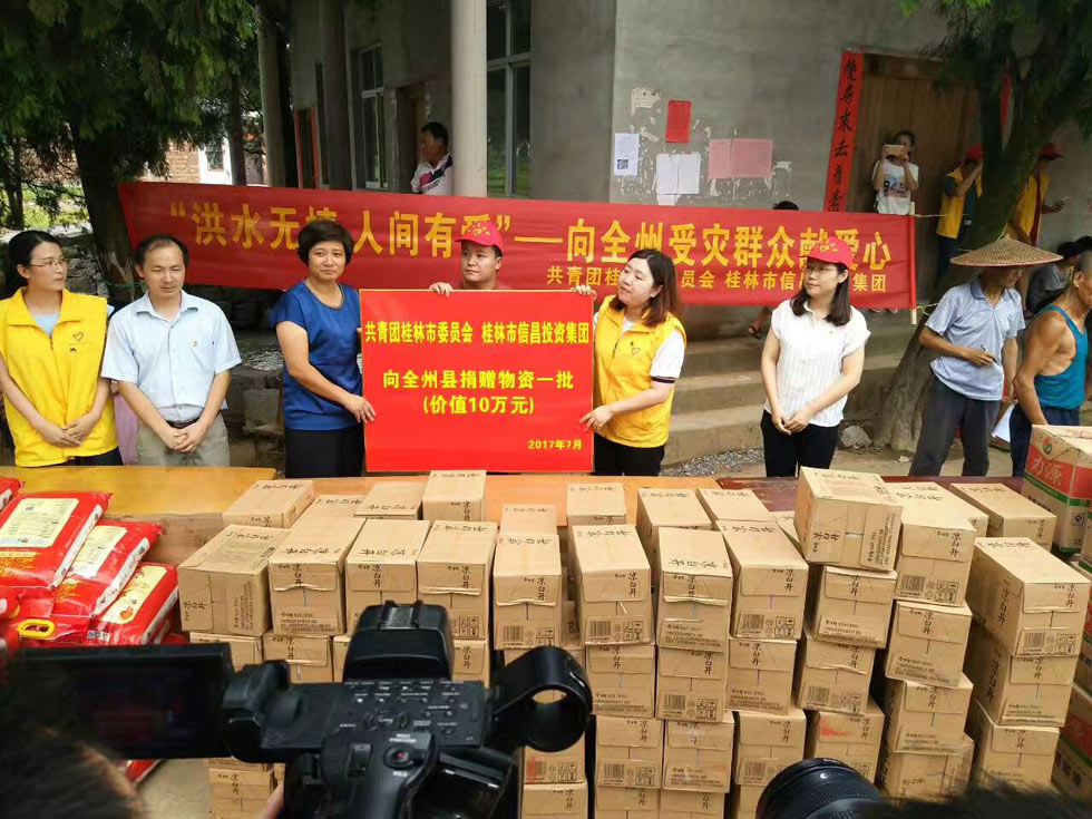 ? ? ?? 一方有難,八方支援。為幫助受災(zāi)群眾渡過難關(guān),信昌集團(tuán)聯(lián)合桂林團(tuán)市委開展賑災(zāi)活動(dòng)對(duì)全州重災(zāi)區(qū)進(jìn)行愛心幫扶。